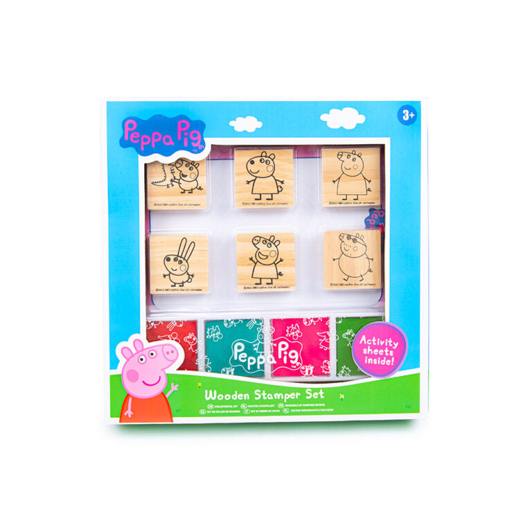 - 6 drvenih pečata s likovima iz crtića Peppa Pig, uključujući Peppu, Georgea, Mamu i Tatu Pig te njihove prijatelje.