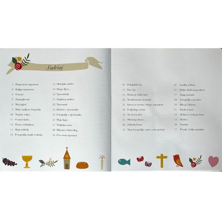 Knjiga uspomena na prvu pričest prekrasan je način da se očuva spomen na izniman dan u životu malih vjernika – dan primanja Kristova tijela. Lijepo ilustrirana knjiga sadrži brojne pjesmice koje slave ljubav prema Bogu i čovjeku te potiču djecu na skladan život u vjeri.