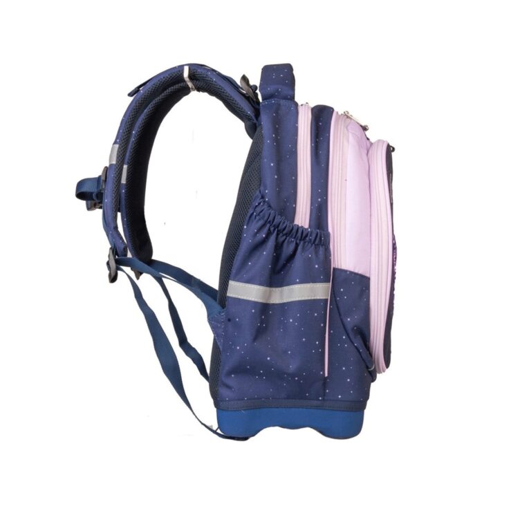 Ergonomski oblikovan leđni dio omogućava protok zraka. Anatomski oblikovane široke naramenice ; remenčići za podešavanje; tvrda podnica, koja kod nošenja čuva knjige od oštećenja; snažno reflektirajući, sigurnosni dijelovi; izrađen je od materijala koji odbija vodu; veliki pretinci za knjige; pretinci na bočnim stranama za bočicu.