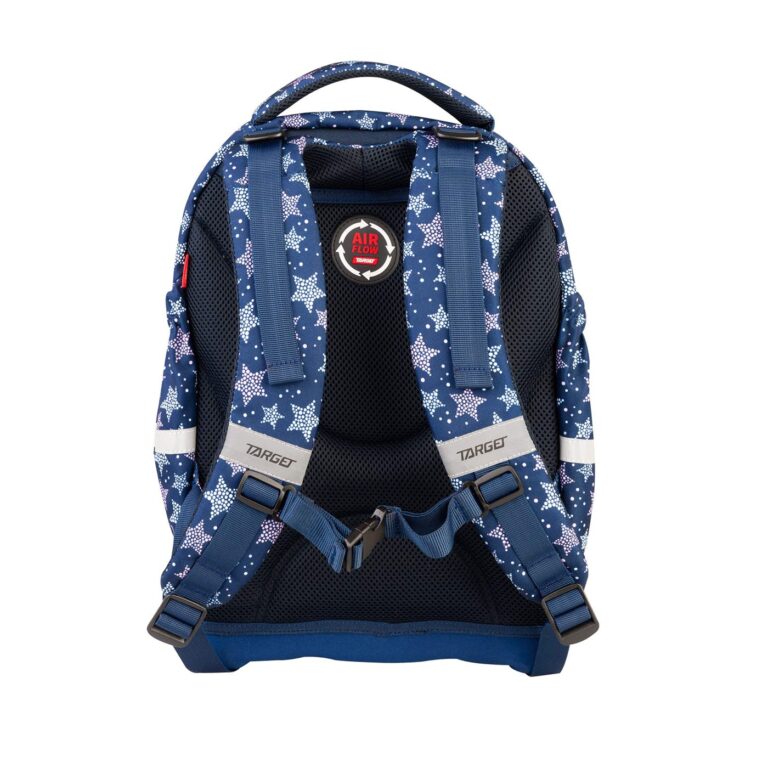 Ergonomski oblikovan leđni dio omogućava protok zraka. Anatomski oblikovane široke naramenice ; remenčići za podešavanje; tvrda podnica, koja kod nošenja čuva knjige od oštećenja; snažno reflektirajući, sigurnosni dijelovi; izrađen je od materijala koji odbija vodu; veliki pretinci za knjige; pretinci na bočnim stranama za bočicu.