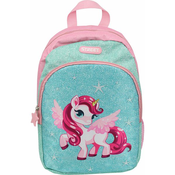 Ruksak za vrtić zanimljivog dizajna. Ima jedan glavni i jedan prednji odjeljak.