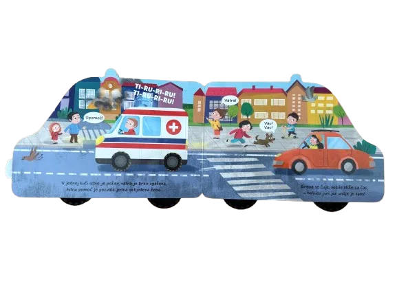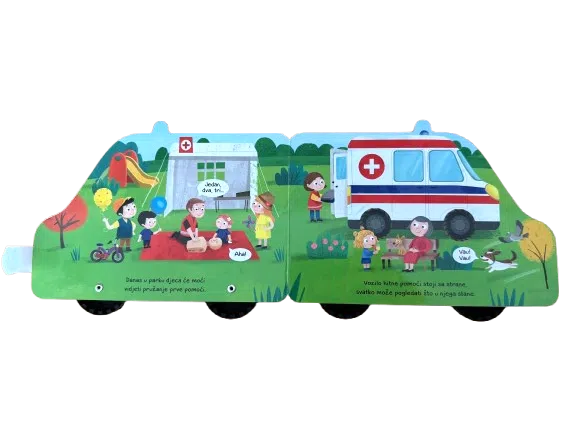Vozilo hitne pomoći stoji sa strane, svatko može pogledati što u njega stane. Slikovnica s pomičnim kotačima koja će razveseliti najmlađe! UPOZORENJE: Proizvod sadrži sitne dijelove, preporučuje se korištenje uz nadzor odrasle osobe.