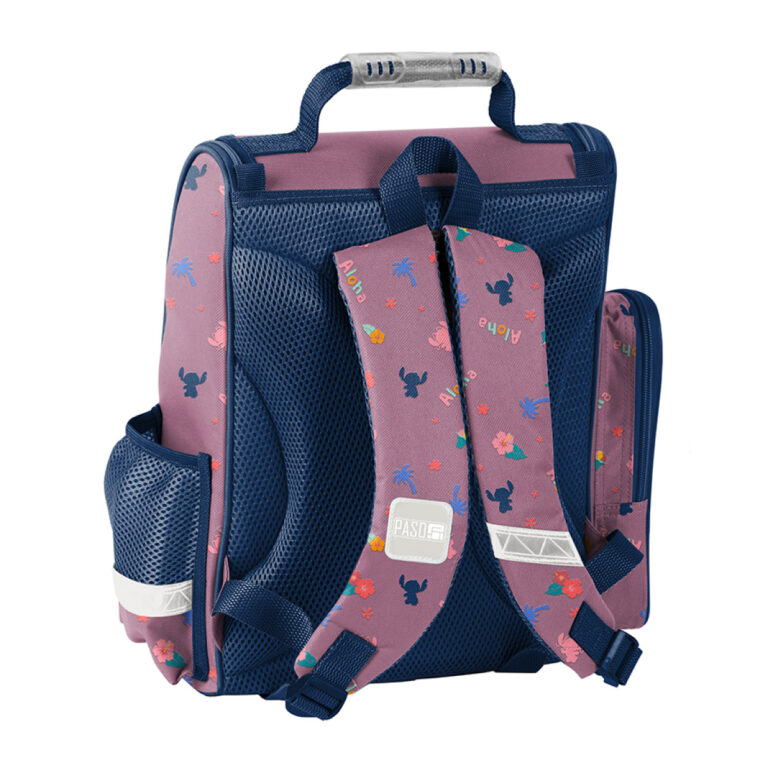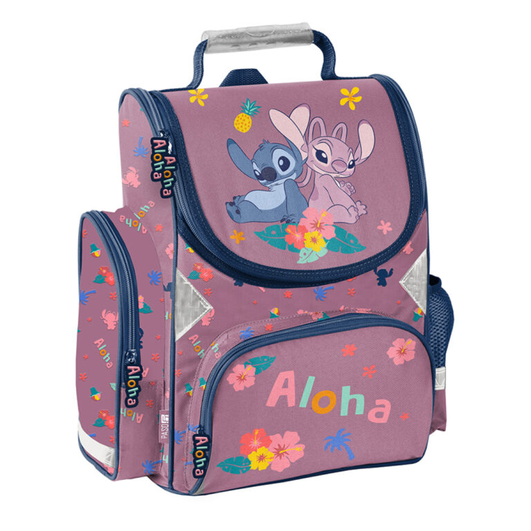 Školska torba Stitch & Angel Aloha ima jedan prostrani pretinac s dvosmjernim patentnim zatvaračem i ukrasnim klizačima za jednostavno zatvaranje. Unutra, pregrade pomažu vašem djetetu da organizira svoje stvari. Funkcionalni džep s patentnim zatvaračem nalazi se na prednjoj strani torbe. Dva bočna džepa nalaze se sa strane: jedan mrežasti džep, savršen za bocu s vodom ili flašicu s vodom, a drugi s patentnim zatvaračem. Ergonomski oblikovana, kruta stražnja strana pruža primjetno olakšanje za kralježnicu mladog vlasnika. Mekane, podesive i konturirane naramenice potiču pravilno držanje i zdravo držanje djeteta. Torba ima ojačano dno i reflektirajuće elemente.