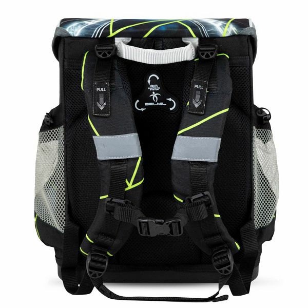 S Belmil školskom torbom sigurnost je zajamčena čak i kada padne mrak: pažljivo postavljene reflektirajuće trake sa svih strana, čvrsta i metalna kopča s reflektirajućom značajkom osiguravaju dobru vidljivost noću.