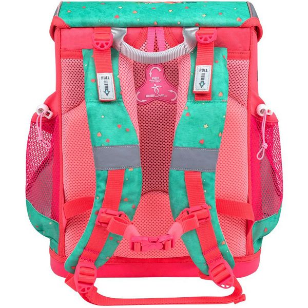 S Belmil školskom torbom sigurnost je zajamčena čak i kada padne mrak: pažljivo postavljene reflektirajuće trake sa svih strana, čvrsta i metalna kopča s reflektirajućom značajkom osiguravaju dobru vidljivost noću.